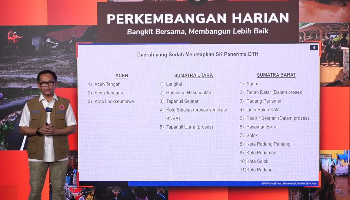 Kepala Pusat Data, Informasi, dan Komunikasi Kebencanaan Badan Nasional Penanggulangan Bencana, Abdul Muhari, menegaskan bahwa pemerintah pusat bersama pemerintah daerah bekerja tanpa jeda guna mempercepat pemulihan di tiga provinsi terdampak.