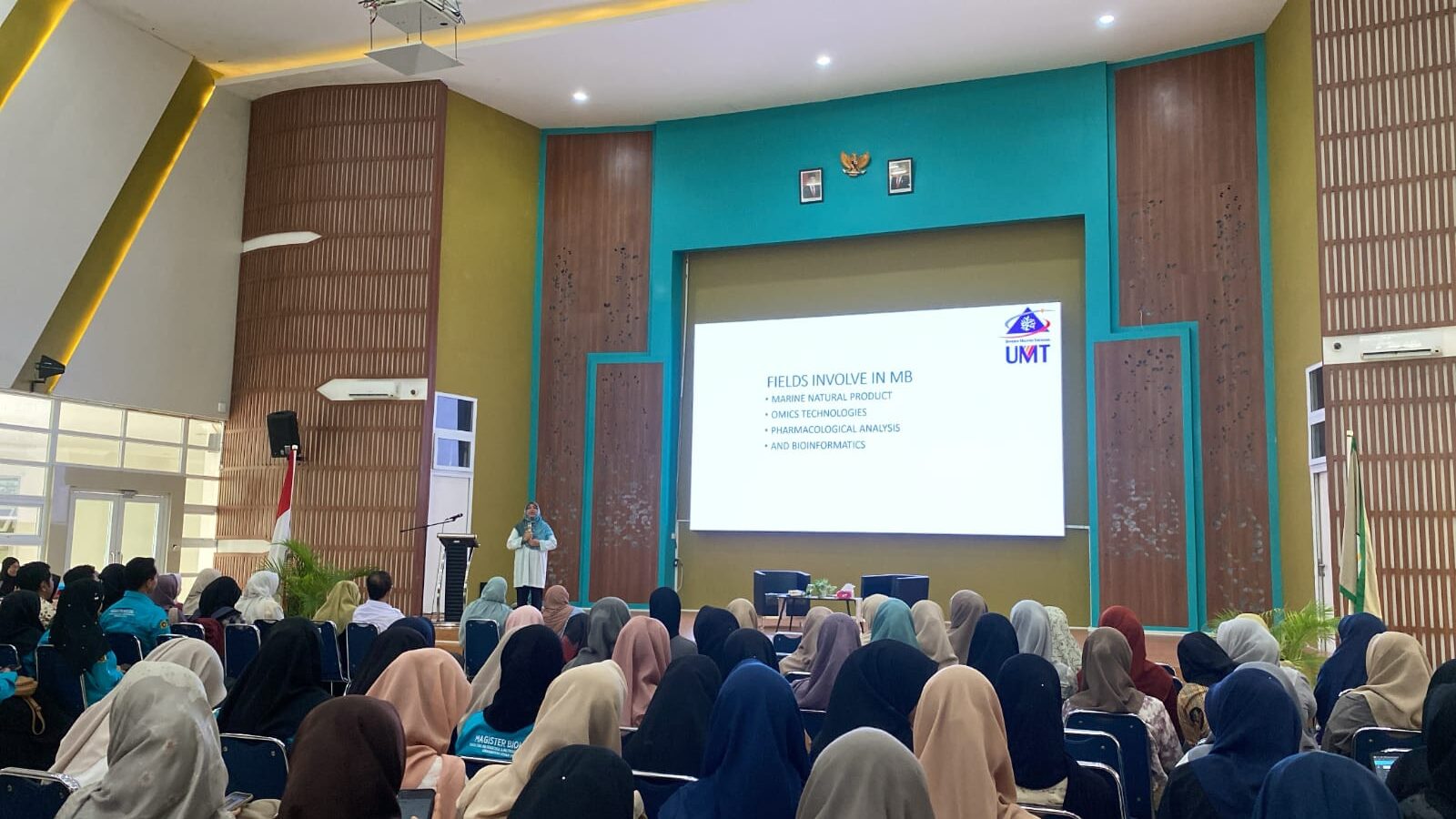Prof Azna juga menjelaskan bahwa, salah satu bidang terkait dengan Marine Biotechnology ini yaitu marine natural product berupa metabolit skunder. Dijelaskan oleh Prof Azna bahwa pada kenyataanya jumlah metabolit skunder yang dapat dimanfaatkan di kawasan laut lebih besar dibandingkan di kawasan hutan.
