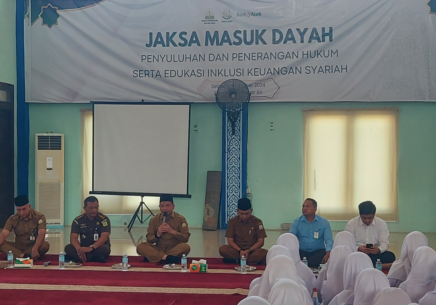 JBNN.Net | Dinas Pendidikan Dayah Aceh bekerja sama dengan Kejaksaan Tinggi (Kejati) Aceh dan Bank Aceh Syariah, menyelenggarakan kegiatan penyuluhan hukum dan edukasi inklusi keuangan syariah di Dayah Madrasah Ulumul Qur’an (MUQ) Pagar Air, Aceh. Selasa 8 Oktober 2024 .