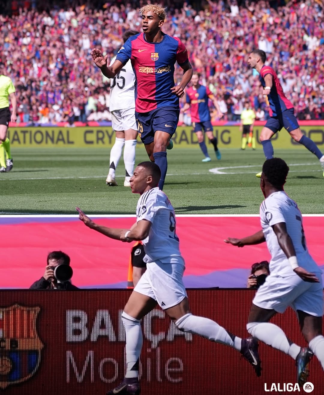 Menit ke-32, Lamine Yamal menyamakan kedudukan lewat tendangan kaki kiri dari sisi kanan kotak penalti. Hanya dua menit berselang, Raphinha mencetak gol untuk membalikkan keadaan menjadi 3-2. Pemain Brasil itu kembali mencatatkan namanya di papan skor menjelang turun minum, kali ini lewat serangan cepat yang membawa Barcelona unggul 4-2.