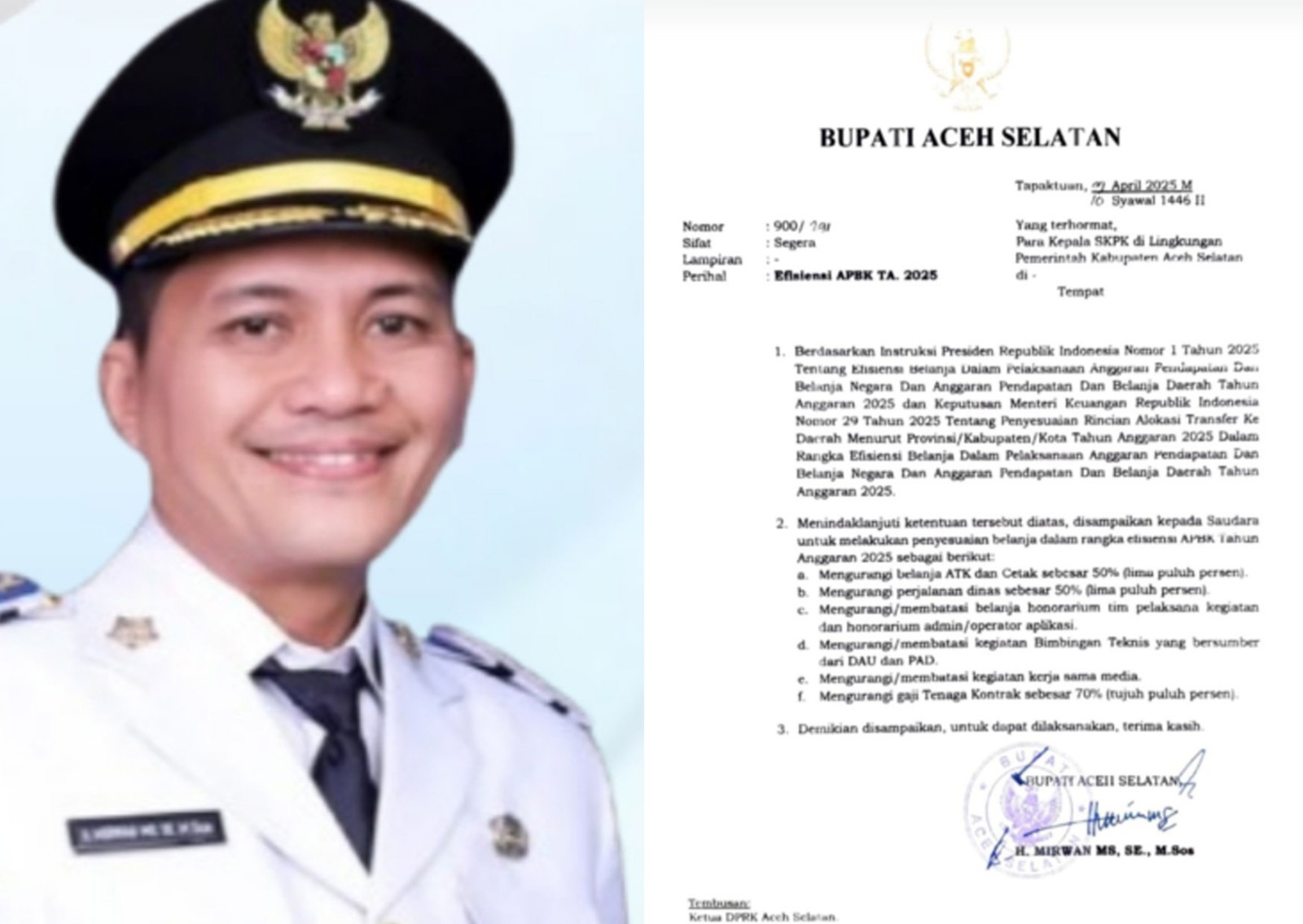 Instruksi yang tertuang dalam surat bernomor 900/291 dan bersifat segera itu ditandatangani langsung oleh Bupati Aceh Selatan H. MIRWAN MS, SE., M.Sos, pada 10 Syawal 1446 Hijriah atau bertepatan dengan 9 April 2025.