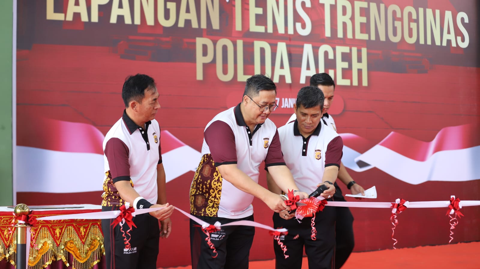Selanjutnya, Kapolda Aceh didampingi Wakapolda dan Ketua Olahraga Tenis menandatangani prasasti serta melakukan pemotongan pita sebagai tanda peresmian Lapangan Tenis Trengginas Polda Aceh. Acara kemudian dilanjutkan dengan pemukulan bola pertama oleh Kapolda sebagai simbol bahwa lapangan tersebut siap digunakan.
