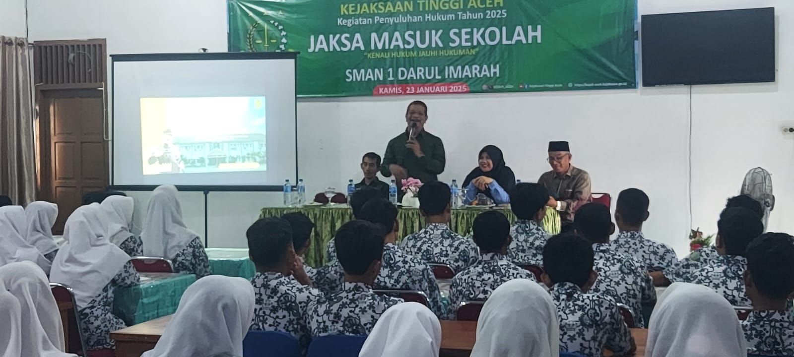 Kepala Seksi Penerangan Hukum (Kasi Penkum) Kejati Aceh, Ali Rasab Lubis pada kesempatan tersebut memberikan penyuluhan mengenai pengetahuan dasar hukum, proses hukum, serta penggunaan hak hukum yang benar kepada siswa dan siswi SMA Negeri 1 Darul Imarah.