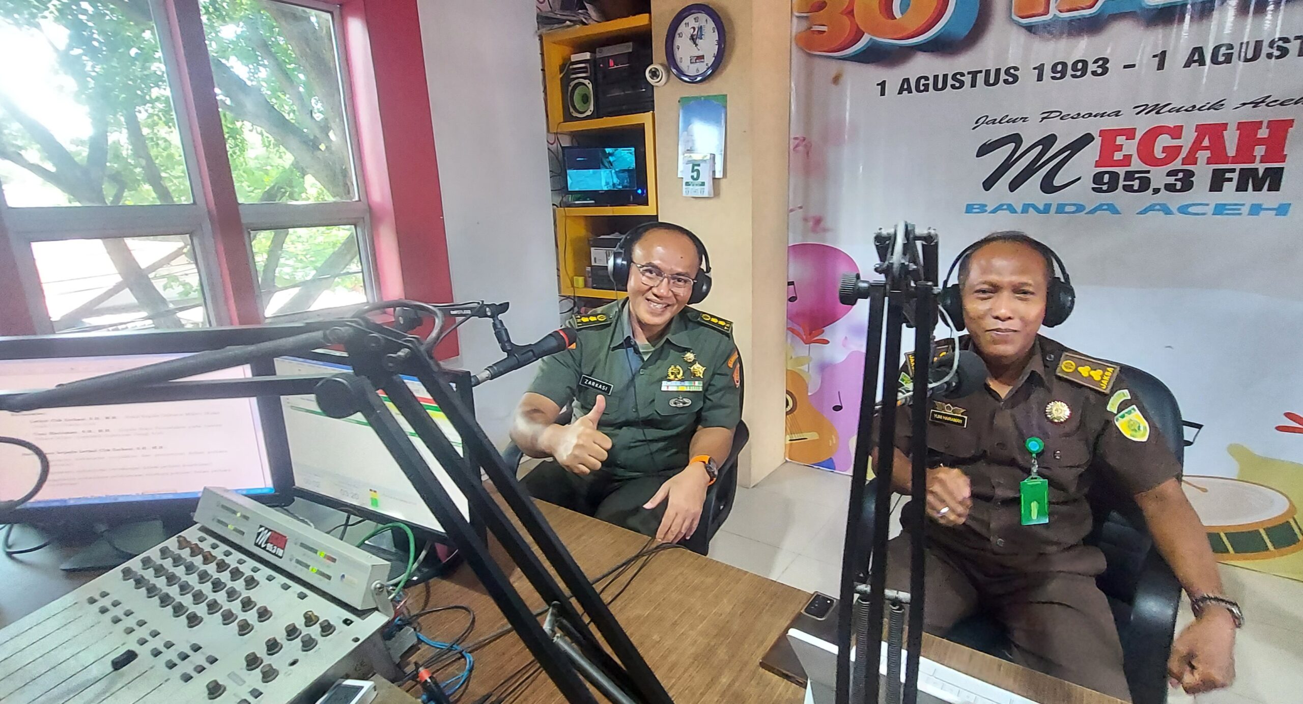 Program dialog interaktif ini menghadirkan dua narasumber utama, yaitu Yuni Hariaman, S.H., M.H., Kepala Seksi Penindakan pada Asisten Pidana Militer (Aspidmil) Kejati Aceh, serta Letkol Chk Zarkasi, S.H., M.H., Wakil Kepala Oditurat Militer I-01 Banda Aceh.