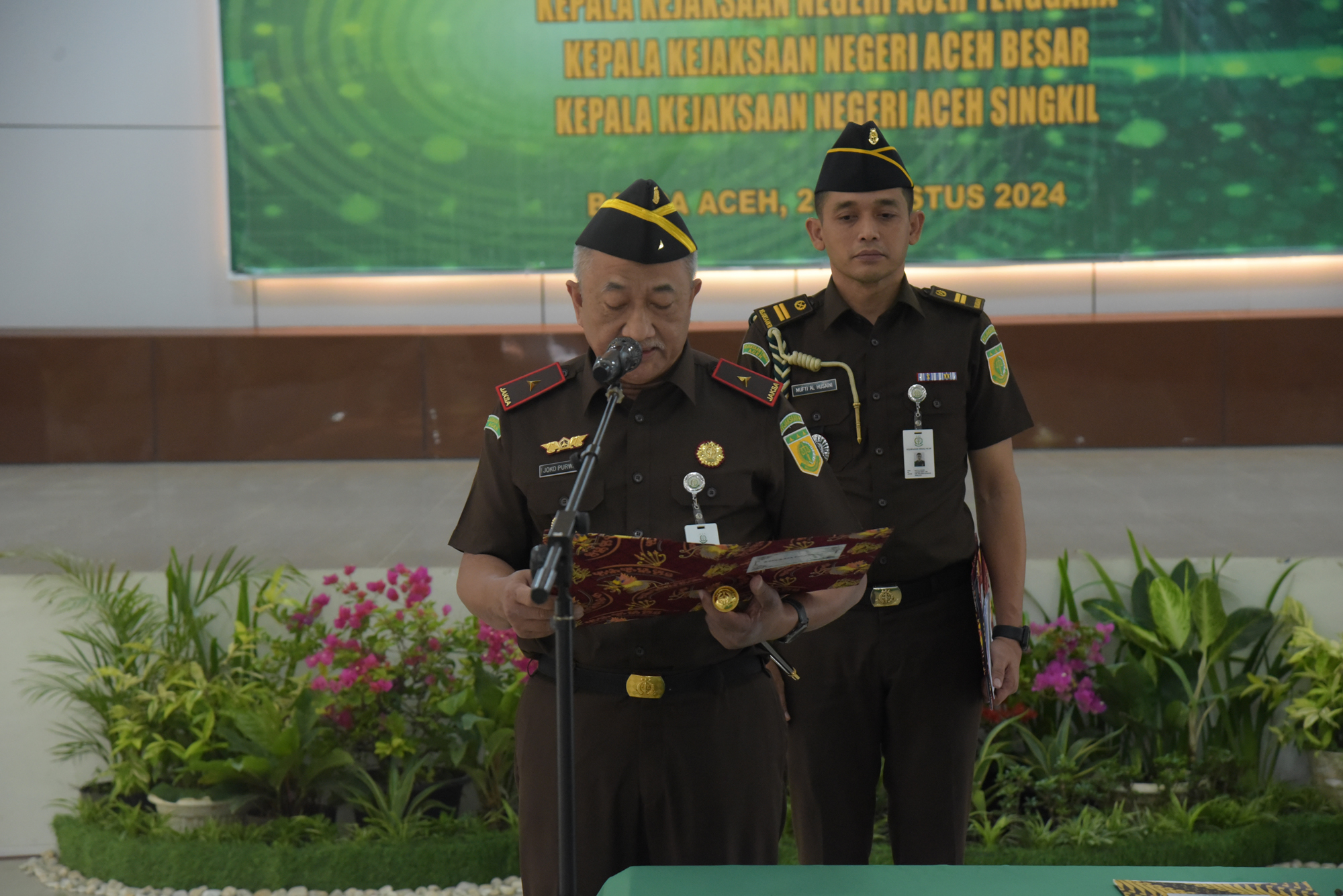 JBNN.Net | Kepala Kejaksaan Tinggi (Kajati) Aceh, Drs. Joko Purwanto, S.H., pada hari Senin (26/8), memimpin upacara pelantikan, pengambilan sumpah, dan serah terima jabatan tiga Kepala Kejaksaan Negeri (Kajari) di ruang Aula Serbaguna Kejati Aceh.Senin 26 Agustus 2024