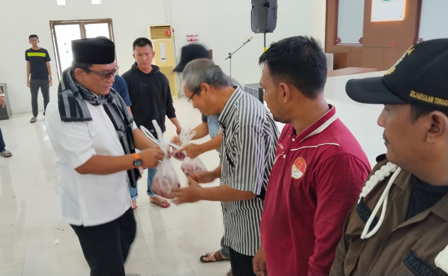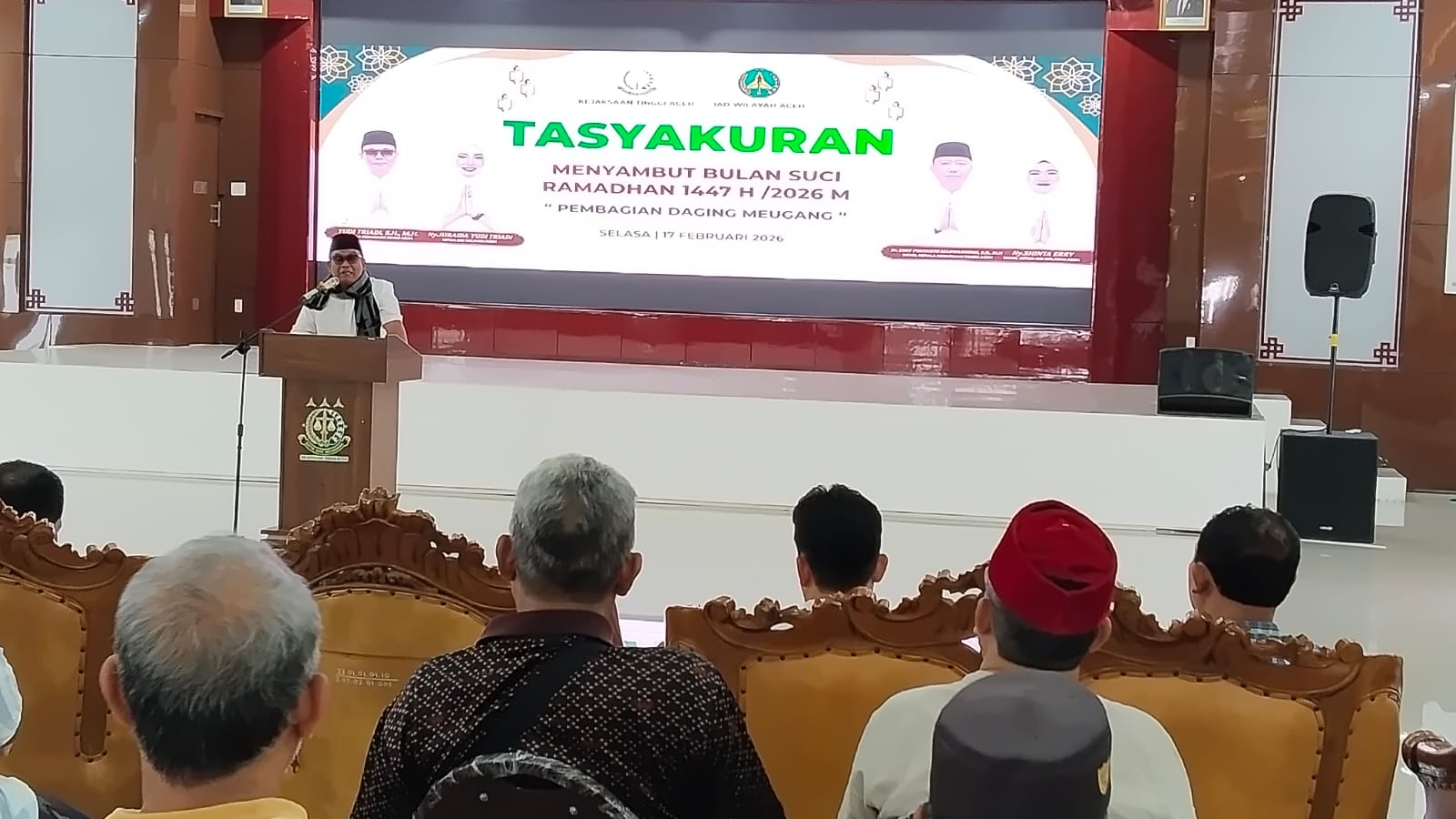 Sebanyak 560 paket daging meugang dibagikan dalam kegiatan yang berlangsung pada Selasa, 17 Februari 2026, di Kantor Kejati Aceh, Banda Aceh.