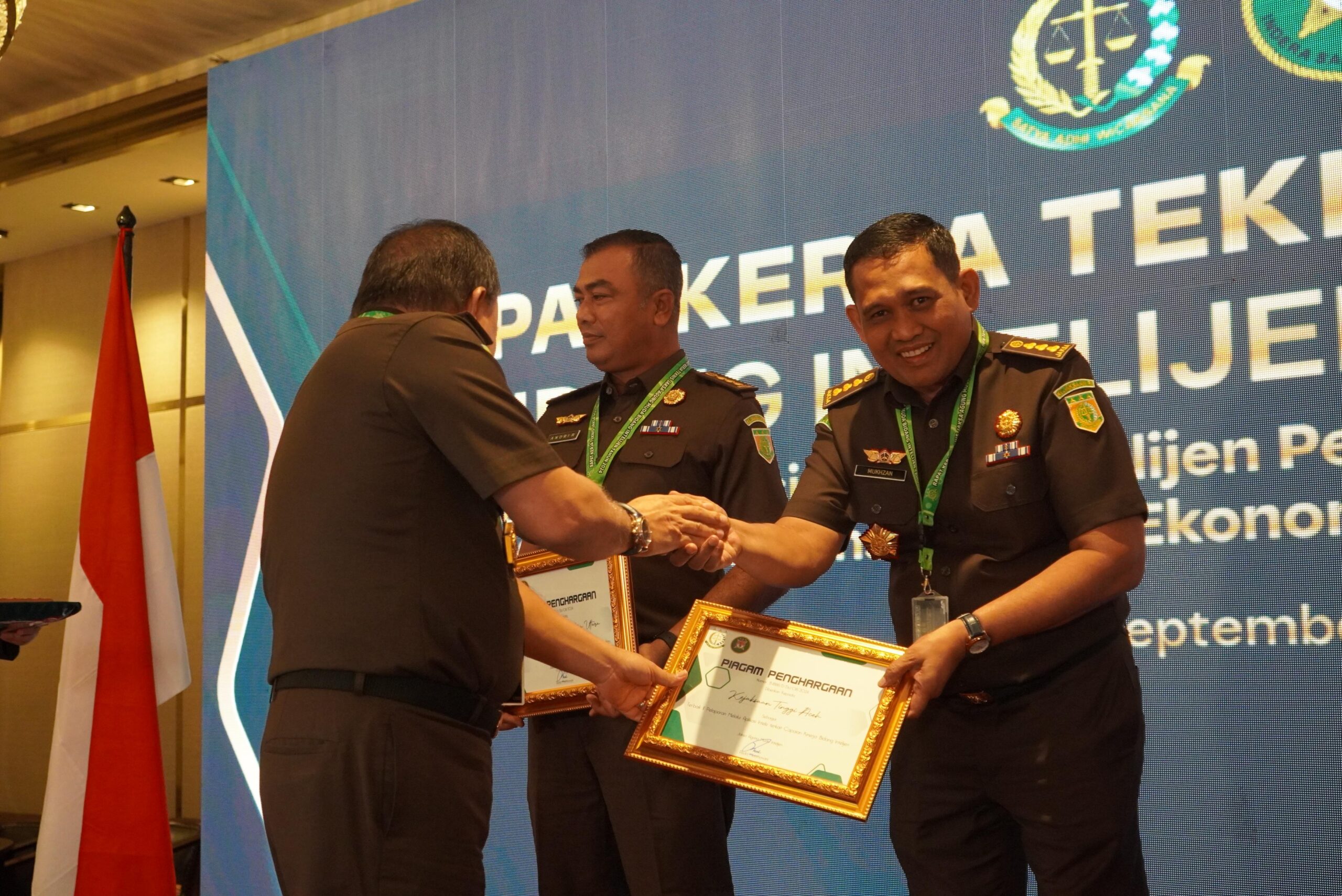 Piagam Penghargaan tersebut diserahkan langsung Plt Jaksa Agung Muda Intelijen Leonard Ebenezer Simanjuntak, S.H.,M.H didampingi Sesjamintel Sarjono Turin kepada Asintel Kejati Aceh Mukhzan, S.H.,M.H saat penutupan Rapat Kerja Teknis (Rakernis) bidang Intelijen Kejaksaan RI Tahun 2024 di hotel Ambhara Jakarta Selatan Kamis (5/9/2024).