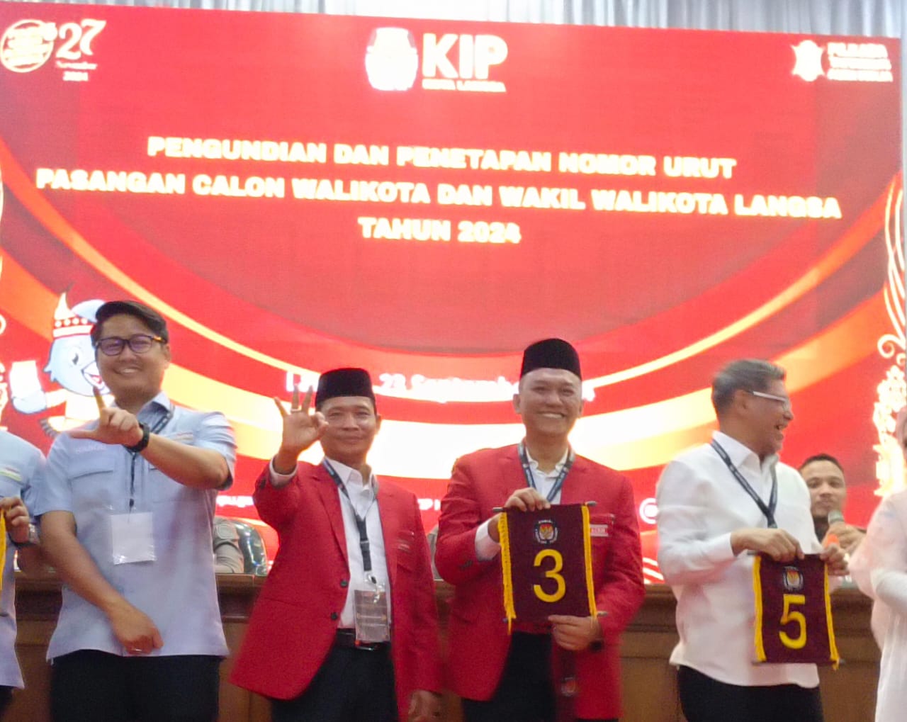 JBNN.Net | Komisi Independen Pemilihan (KIP) kota Langsa telah menggelar acara pengundian dan penetapan nomor urut pasangan calon Wali Kota dan Wakil Wali Kota Langsa tahun 2024 di Alua Tirta Convention Paya Bujok Teungoh, Kecamatan Langsa Kota, pada Senin, 23 September 2024.