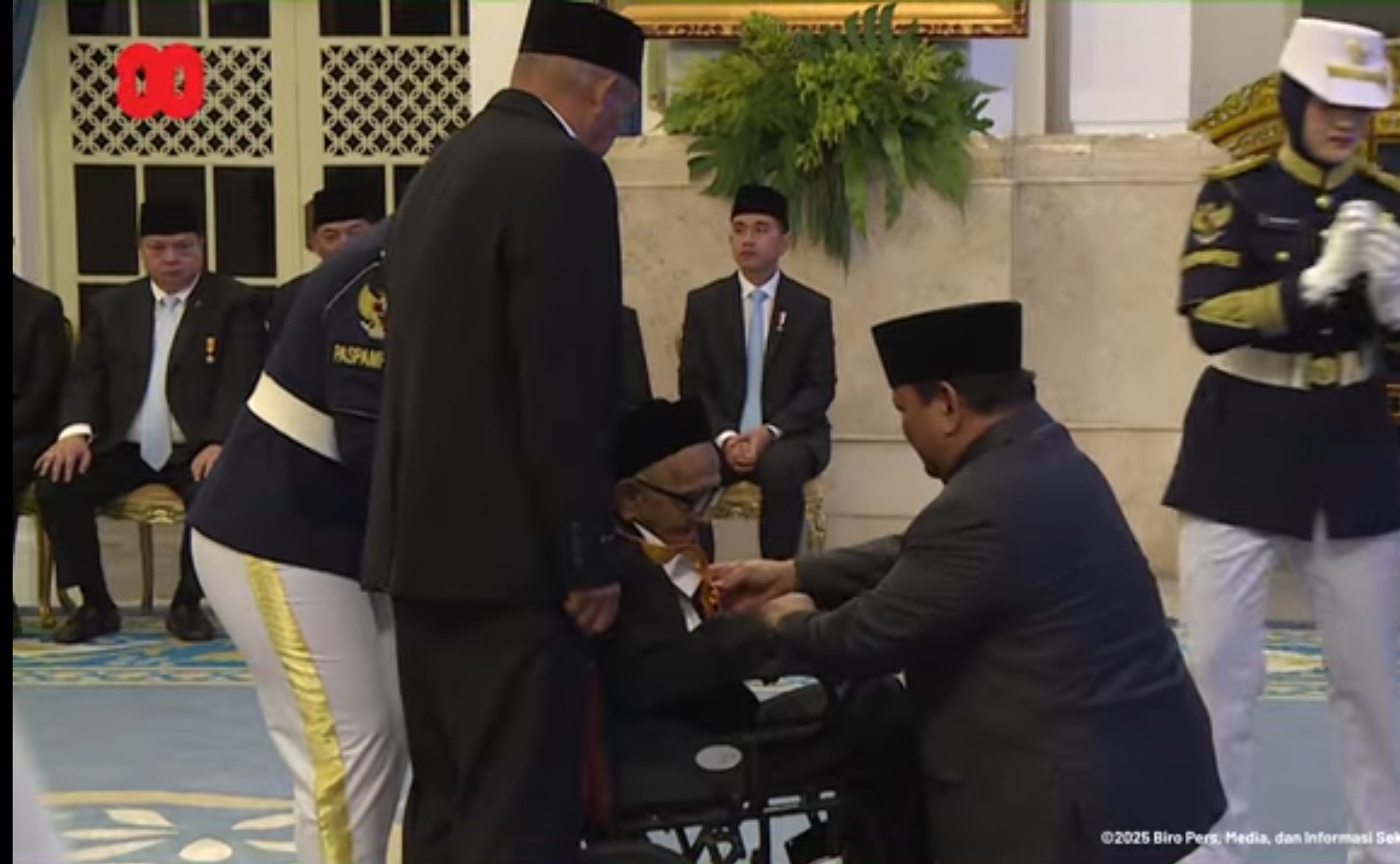 Pria kelahiran Aceh 1927 ini hadir langsung menerima tanda kehormatan dari Prabowo di Istana. Nyak Sandang hadir menggunakan kursi roda dibantu keluarga.