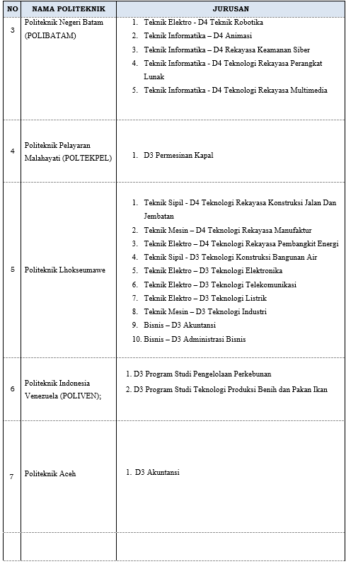– SMK Jurusan Otomotif, Teknik pendingin dan tata udara, Teknik Perkapalan program keahlian instalasi permesinan kapal dan teknik listrik kapal, Teknik mesin, Listrik, Elektronika, dan Mekatronika, serta jurusan instrumentasi industry program keahlian control proses dan control mekanik;
