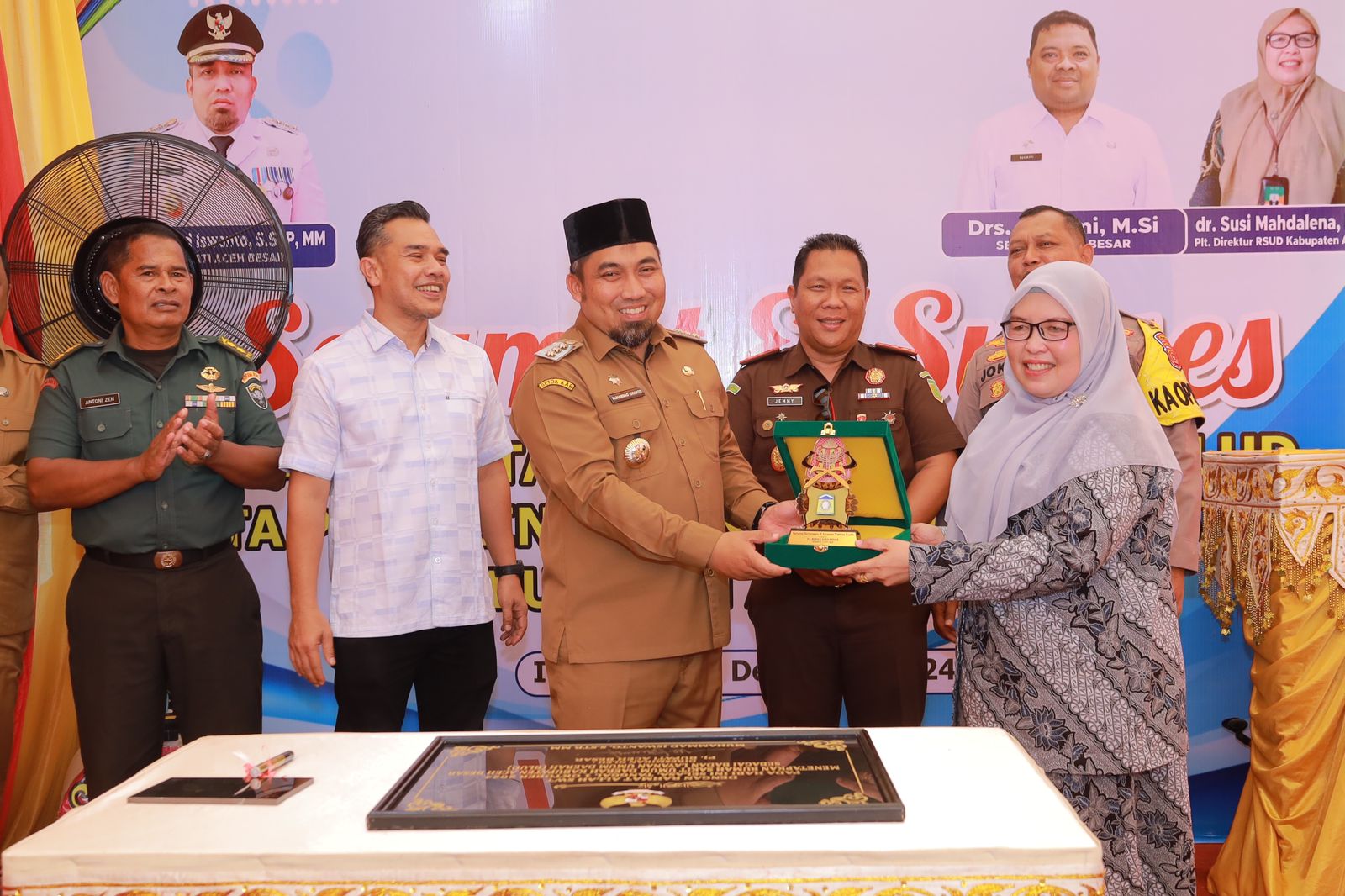 Peresmian dan Penandatanganan Prasasti Acara ini ditutup dengan penandatanganan prasasti oleh Pj Bupati Aceh Besar sebagai tanda resmi ditetapkannya BLUD RSUD Aceh Besar. Penandatanganan ini disertai dengan pemukulan rapai sebagai simbolis peresmian BLUD RSUD Aceh Besar.