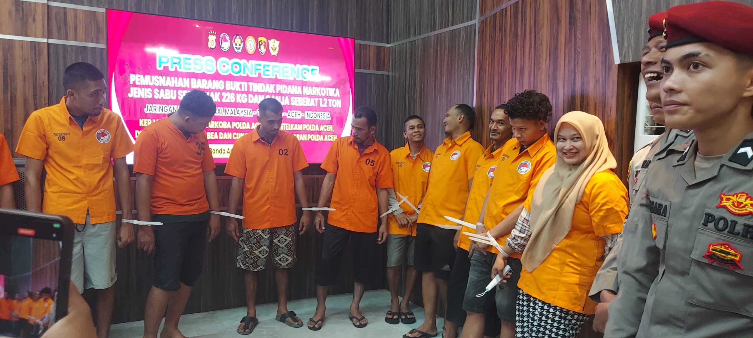 “Hari ini kita akan melakukan pemusnahan barang bukti hasil pengungkapan narkoba tahun 2024 berupa 226 kg sabu dan 1,2 ton ganja. Pengungkapan ini merupakan jaringan internasional Malaysia, Thailand, dan Aceh (Indonesia) kurun waktu tiga bulan terakhir,” kata Kapolda Aceh Irjen Achmad Kartiko, dalam konferensi pers pemusnahan barang bukti tersebut.