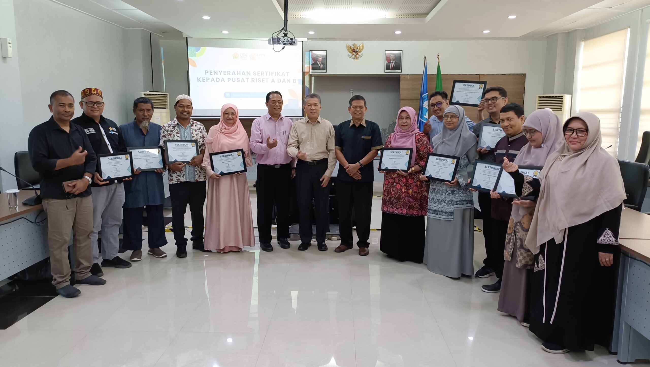 Penghargaan ini diberikan secara resmi oleh Rektor USK dalam kegiatan Penyerahan Sertifikat Pusat Riset Kategori A dan B, yang digelar di Ruang Balai Senat, Kantor Pusat Administrasi USK, pada Rabu, 30 April 2025.