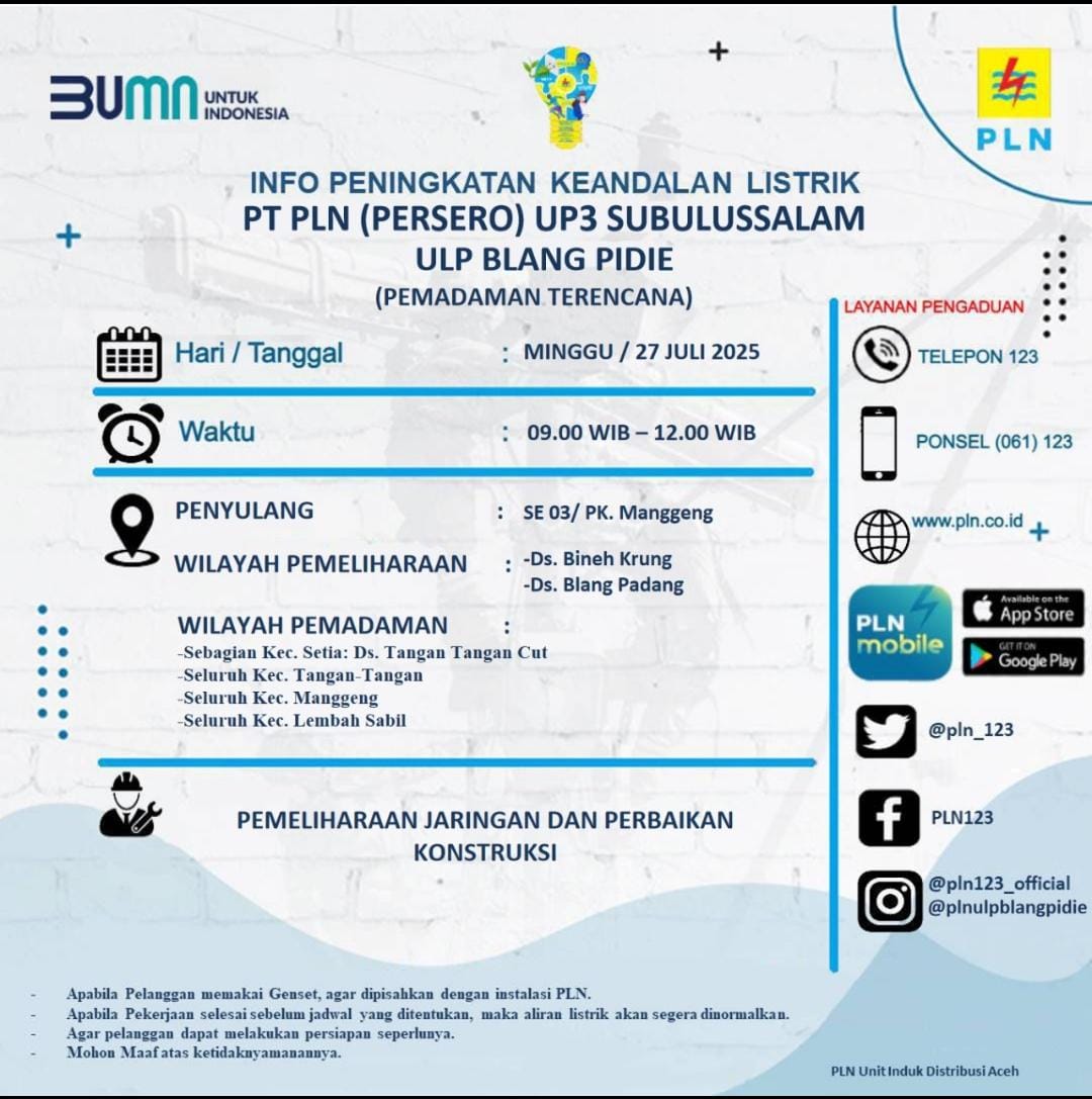 PT PLN (Persero) UP3 Subulussalam melalui ULP Blangpidie menyatakan pemadaman ini sebagai upaya mendukung pekerjaan saat melakukan pemeliharaan jaringan serta perbaikan konstruksi.