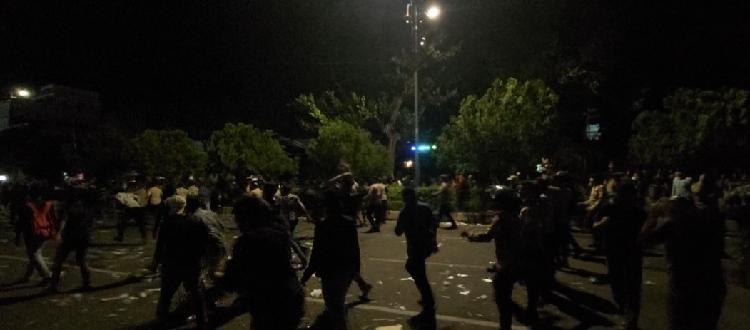 Situasi yang semula kondusif berubah tak terkendali saat azan Shalat Magrib berkumandang. Usai salat berjamaah, terdengar ledakan petasan dari kerumunan massa di luar area gedung. Aparat keamanan yang berjaga kemudian bergerak untuk membubarkan kerumunan.