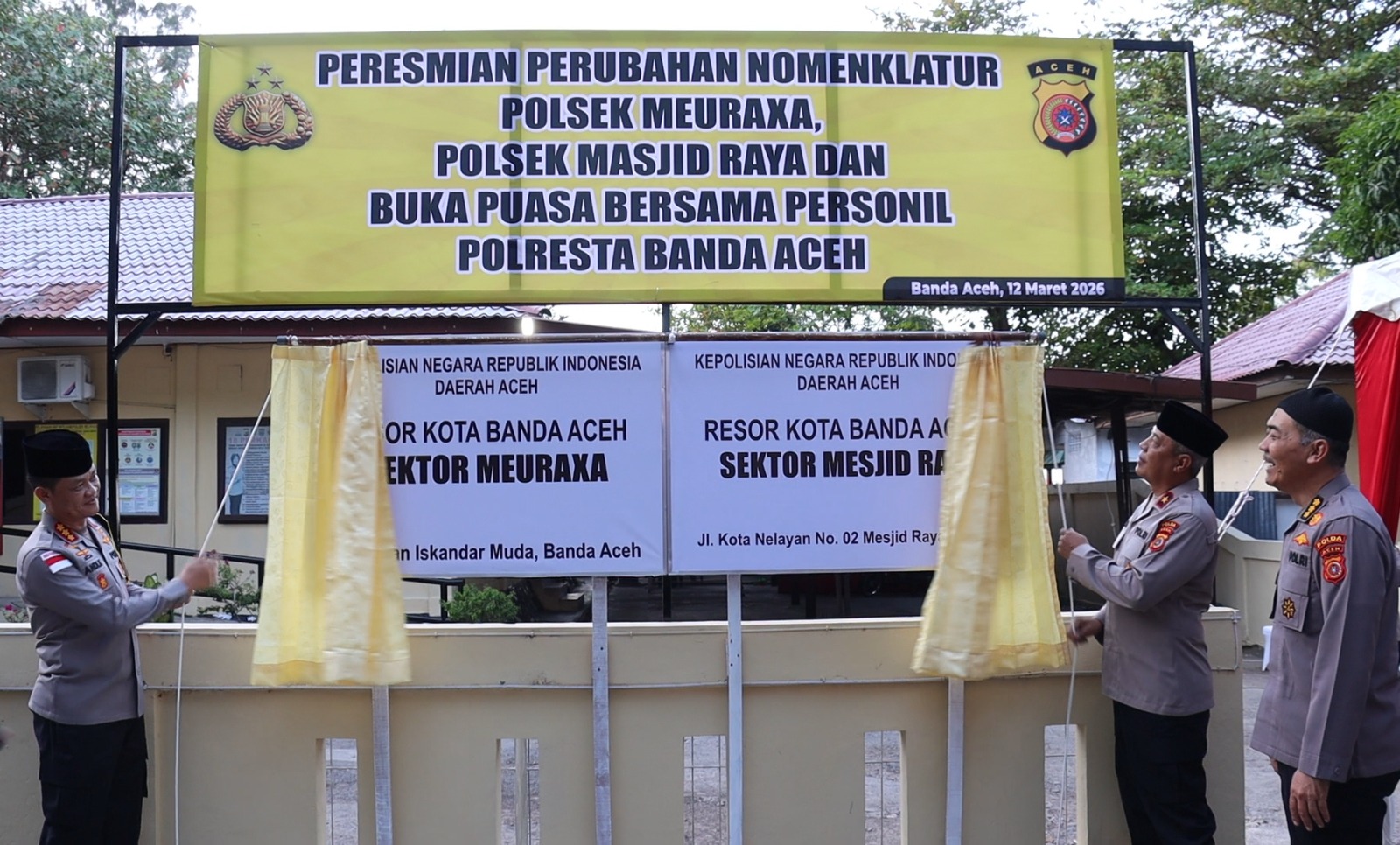 JBNN.net | Wakapolda Aceh meresmikan perubahan nomenklatur dua kepolisian sektor (Polsek) di wilayah hukumnya, yakni Polsek Ulee Lheue menjadi Polsek Meuraxa dan Polsek Krueng Raya menjadi Polsek Mesjid Raya.