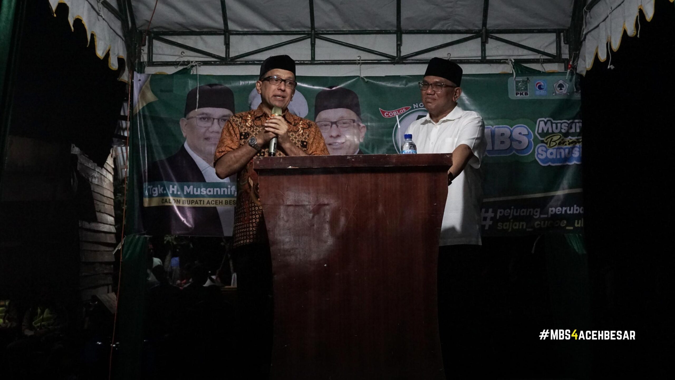 Musannnif Bersama Sanusi dalam orasi politik dihadapan seluruh tim pemenangan, relawan dan simpatisan dari kecamatan mesjid raya, menjawab dua pertanyaan dari Keuchik Lamnga mewakili keuchik dan mukim dalam kecamatan tersebut.